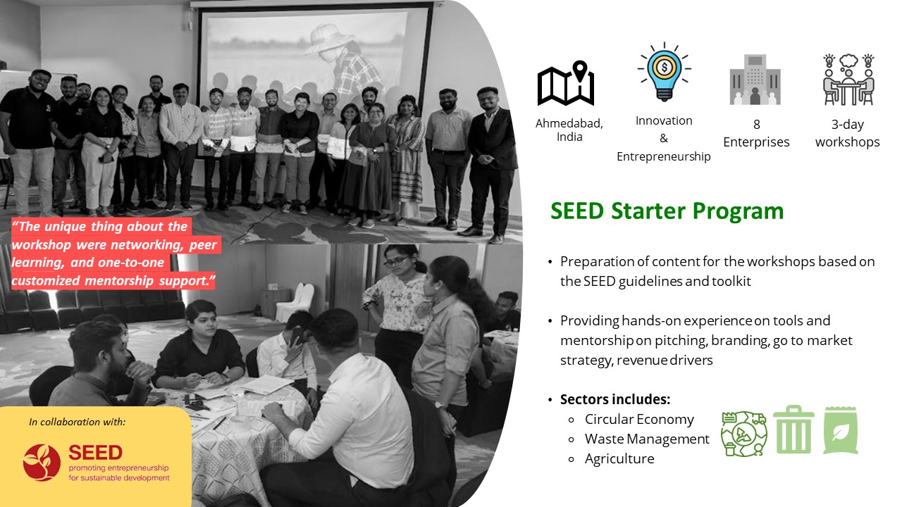 Established in 2002 at the World Summit on Sustainable Development and founded by UN bodies, SEED has been an active catalyst in promoting eco-entrepreneurship worldwide. Ekonnect is engaged with SEED and Circular Economy Catalyst(CEC), another program managed by Adelphi, Germany, under SEED. This Green Entrepreneurship programme focuses on MSMEs in India to further circular and green growth. Since 2013, SEED has been a crucial player in India's transition to a low-carbon and green economy.